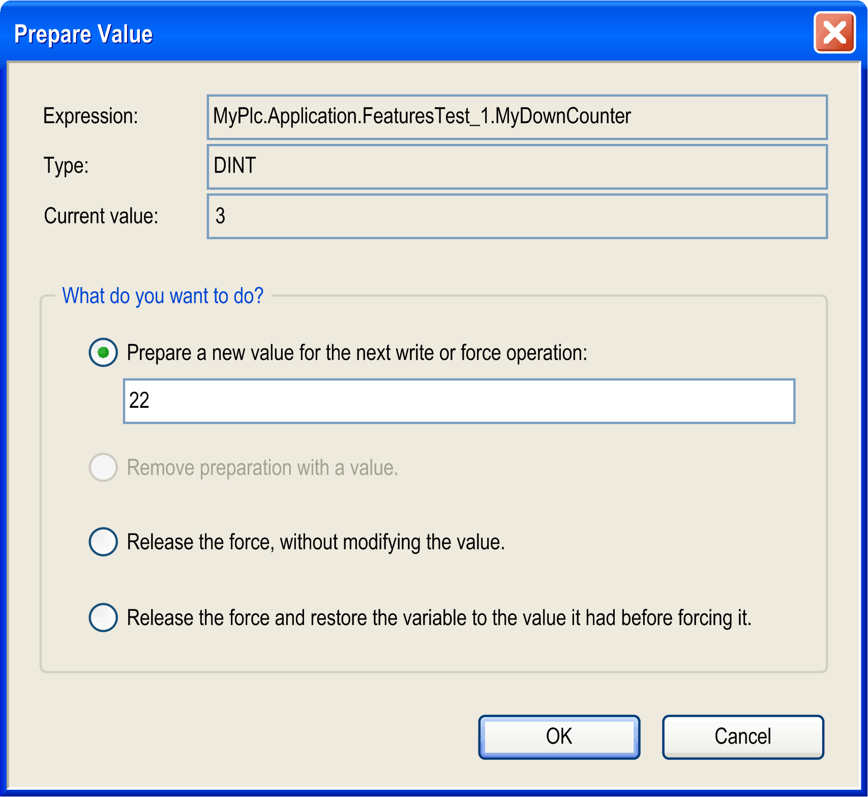 In online mode, you can prepare a value for forcing or writing a variable either in the declaration editor or within the editor. Double-click a variable in the editor to open the following dialog box: