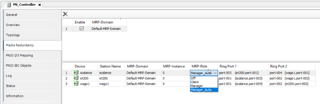All participants of an MRP ring (also: MRP domain) have to be configured as a media redundancy client (MRC) and at least one of them as a media redundancy manager (MRM). If there is no physical malfunction of the rings, then the MRM interrupts the ring to prevent an infinite loop of Ethernet data. When a malfunction is detected, the MRM opens the ring and the participants in the disconnected network segment can be reached again.