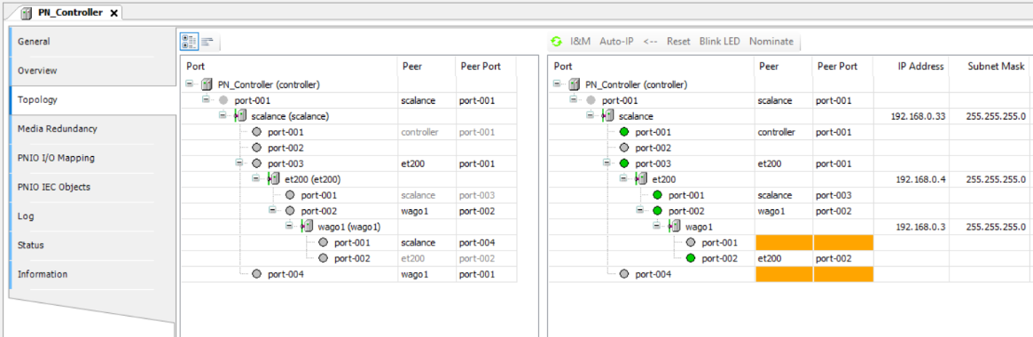 In the topology editor, configure the port switching of the PROFINET devices. In the simplest case, a real existing line topology, which is not yet closed to the ring, can also be imported into the project using the import function. Then close the ring in the configuration.