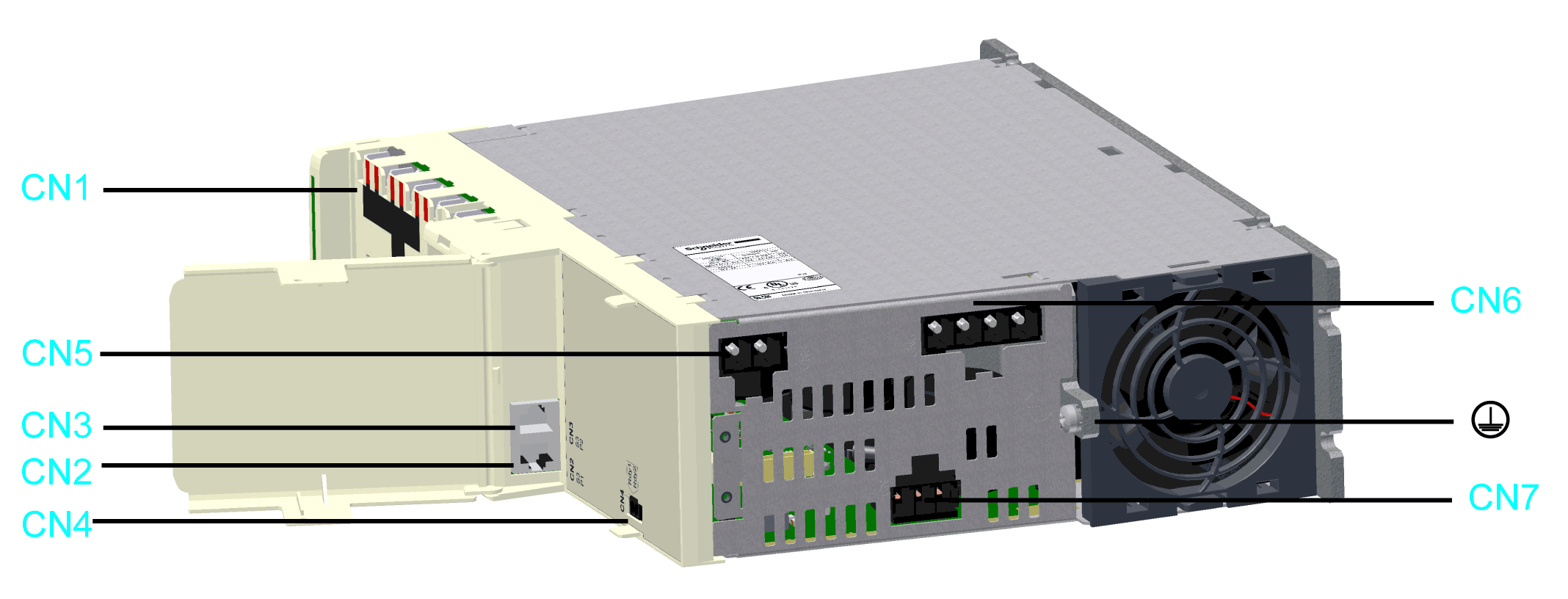 The 24 V input supplies the internal logic assemblies as well as the holding brakes of the axis group, connected to the axis modules.