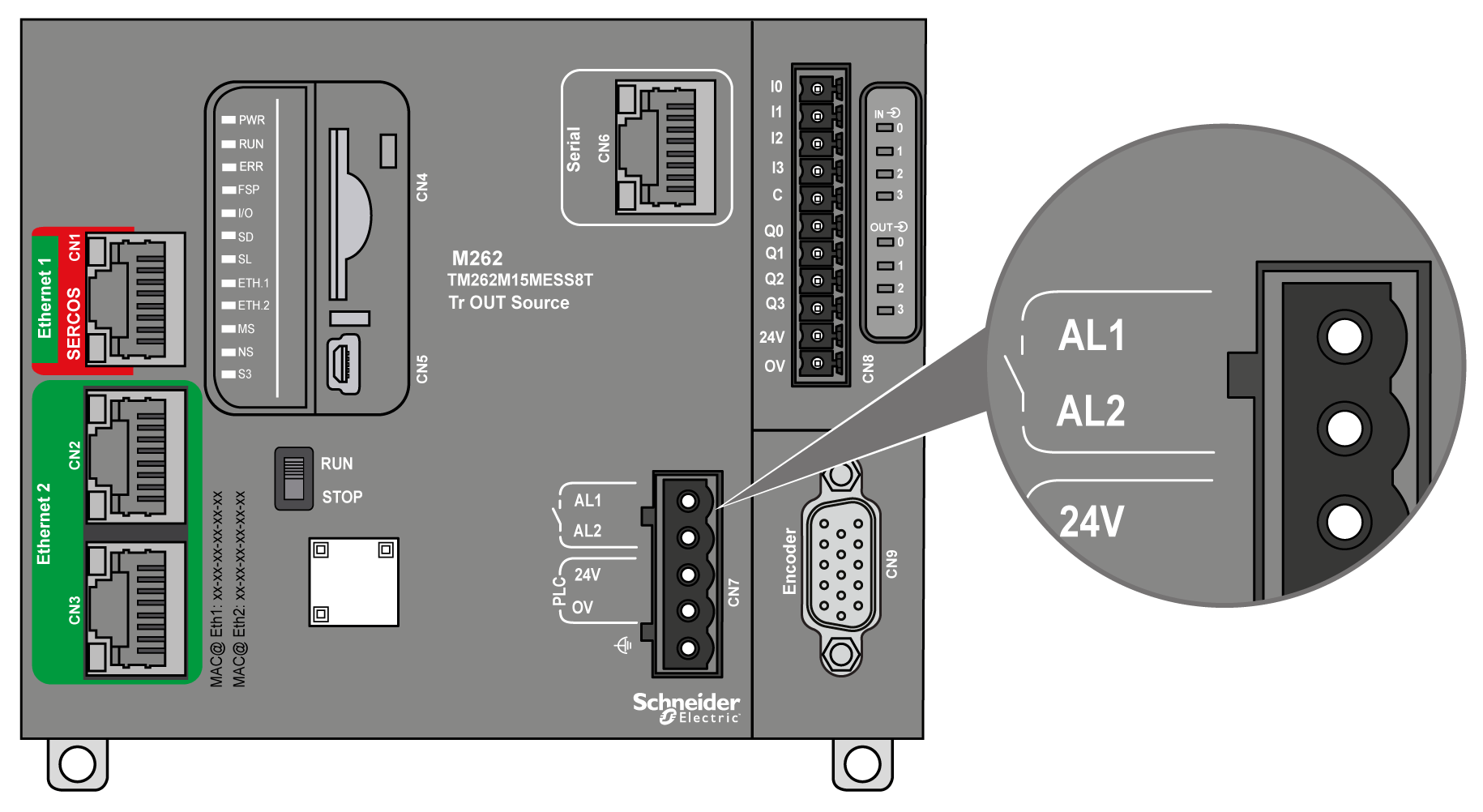 The M262 Logic/Motion Controller has integrated relay connections that can be wired to an external alarm: