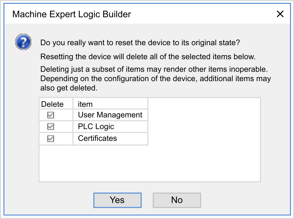 Effect: Resets all variables, including the remanent variables, to their initialization values. Erases all user files on the controller, including user rights and certificates. Reboots and places the controller into the EMPTY state.