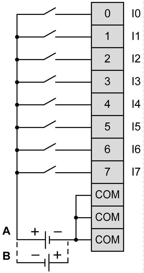 The following figure illustrates the connection between the inputs, the sensors, and their commons: