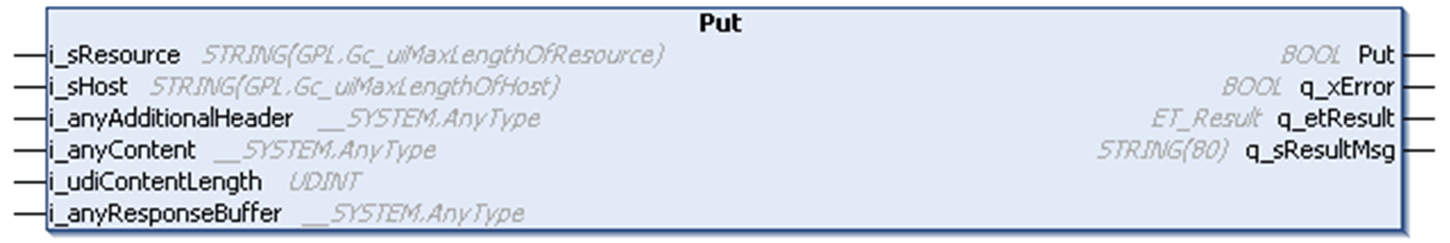 El encabezado predeterminado de la petición HTTP se crea mediante las entradas i_sHost (obligatoria) y i_sResource. Si es necesario añadir otra información al encabezado, esta deberá transmitirse a través de la entrada i_anyAdditionalHeader. Los datos asignados a esta entrada no se comprueban. En la entrada i_anyResponseBuffer, deberá asignar un búfer con un tamaño suficiente para almacenar la respuesta entera que se reciba del servidor.