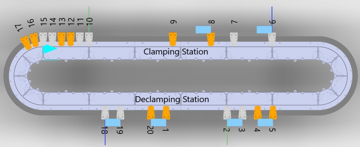 In the Clamping Station, four carriers (6, 7, 8, and 9) are in the process. They constitute two carrier pairs with a process gap of 100 mm between the pairs. The process gap within a carrier pair is 200 mm. Eight carriers (10 - 17) are waiting with a waiting gap of 10 mm.