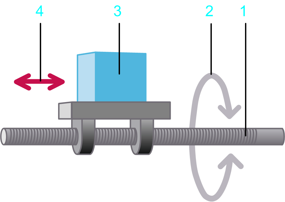 El paso de una rosca en el perno conductor. El paso de una rosca en el perno conductor determina la relación de transmisión entre el movimiento lineal de la carga y el movimiento giratorio del eje de entrada. |