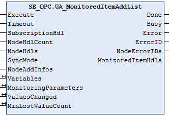 El bloque de funciones UA_MonitoredItemAddList se usa para añadir elementos supervisados a una suscripción usando una lista de controladores de nodos.
