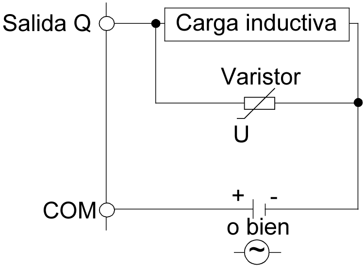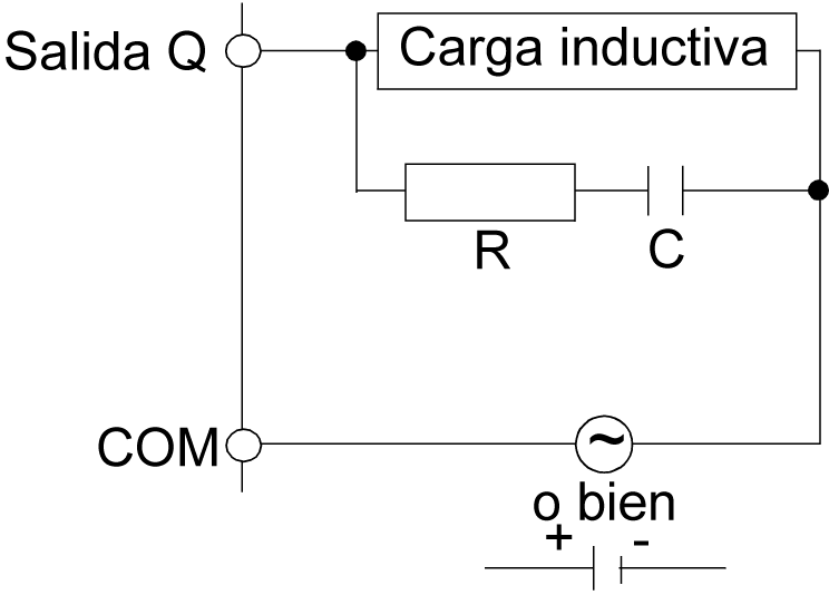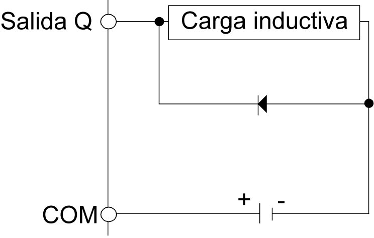 En función de la carga, es posible que sea necesario un circuito de protección para las salidas ubicadas en los controladores y determinados módulos. Las cargas inductivas con tensiones de CC pueden crear reflexiones de tensión que provocarán un rebasamiento que dañará o acortará la vida útil de los dispositivos de salida.