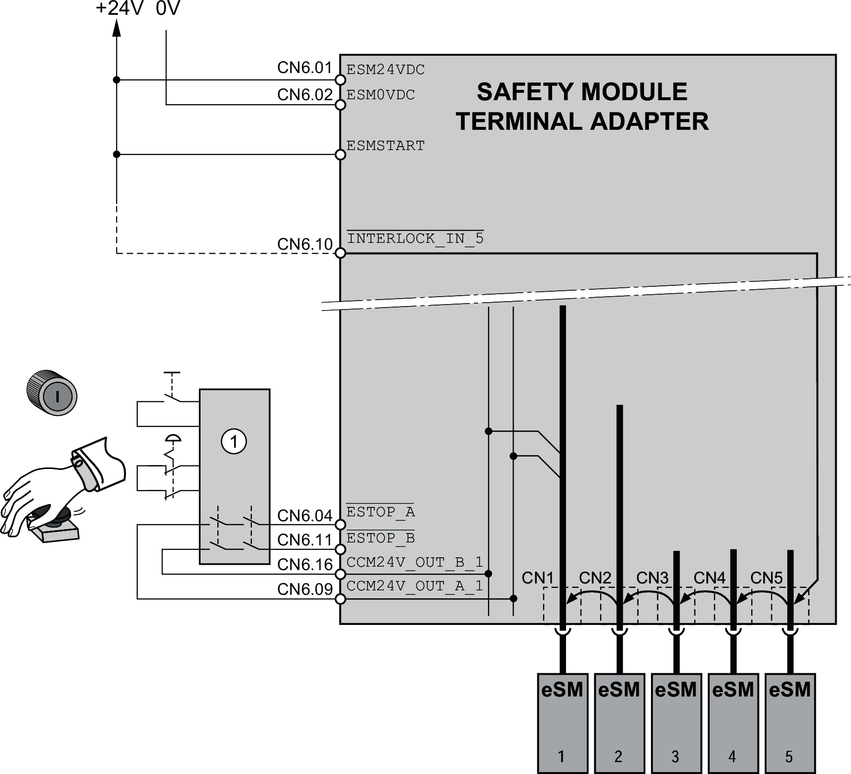 Si le relais de sécurité externe nécessite un signal de démarrage, il n'est pas nécessaire d'ajouter un signal de démarrage supplémentaire au module de sécurité eSM. Le mode de démarrage automatique doit être activé à l'aide du paramètre eSM_BaseSetting.
