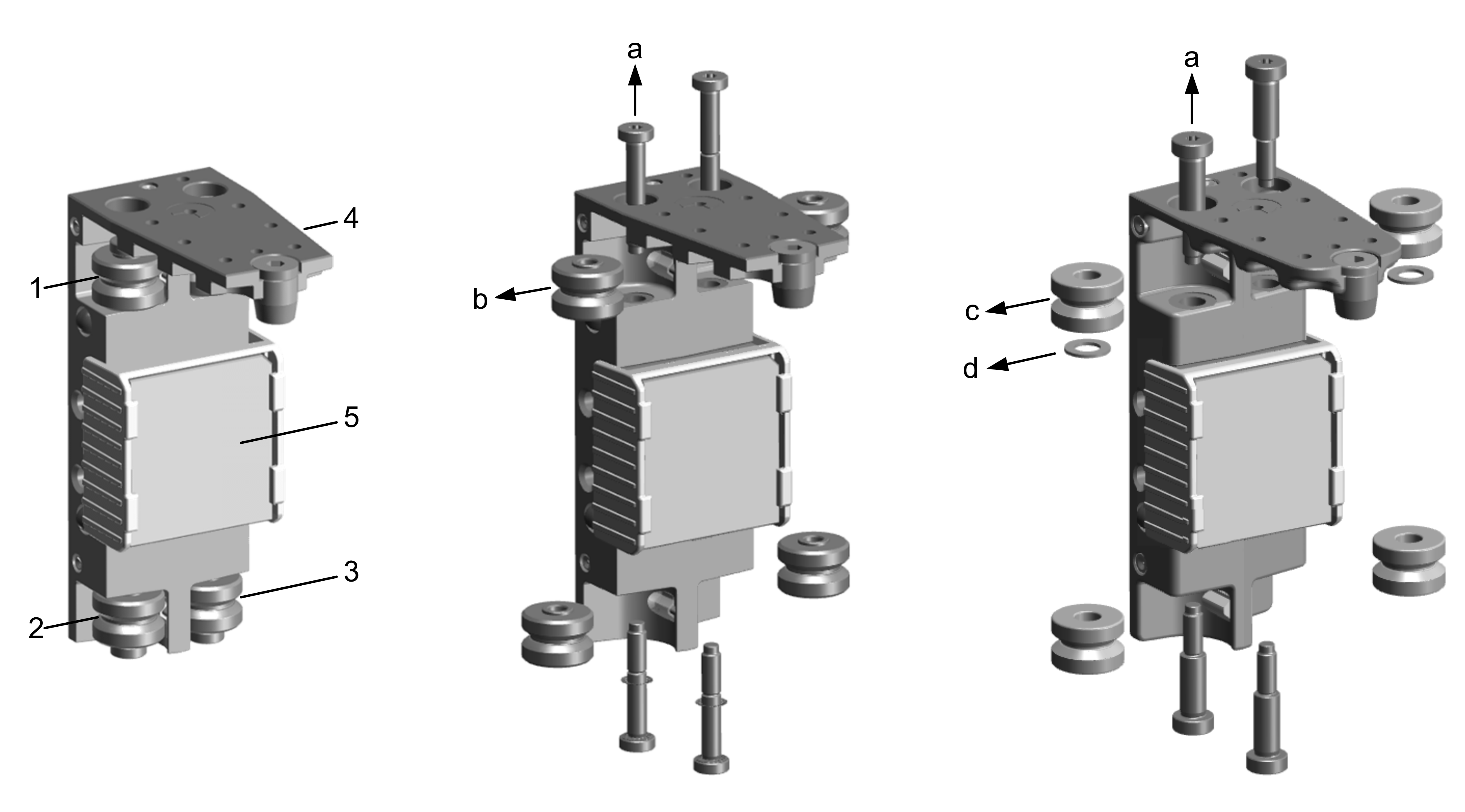 Version 1: Insert a new roller (b) to the carrier and fix the roller with a new screw. Version 2, upper rollers (c) with a washer (d): First, insert the washer (d) in the hole. Then fix the roller with a new screw. Version 2, lower rollers (c) without washer (d): Insert a new roller (c) to the carrier and fix the roller with a new screw.