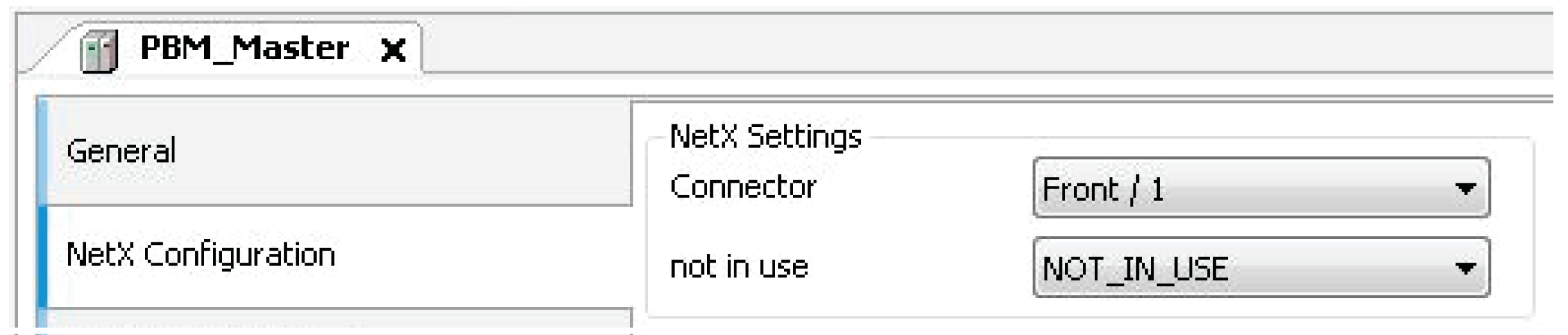 In a NetXfield bus, the dialog box is provided as a tab in the device editor of the NetX field bus, to select the NetX chip (slot of the board) and the communication channel on this chip. The name of the setting in the dialog box and the possible settings available in the selection lists are defined by the device description.