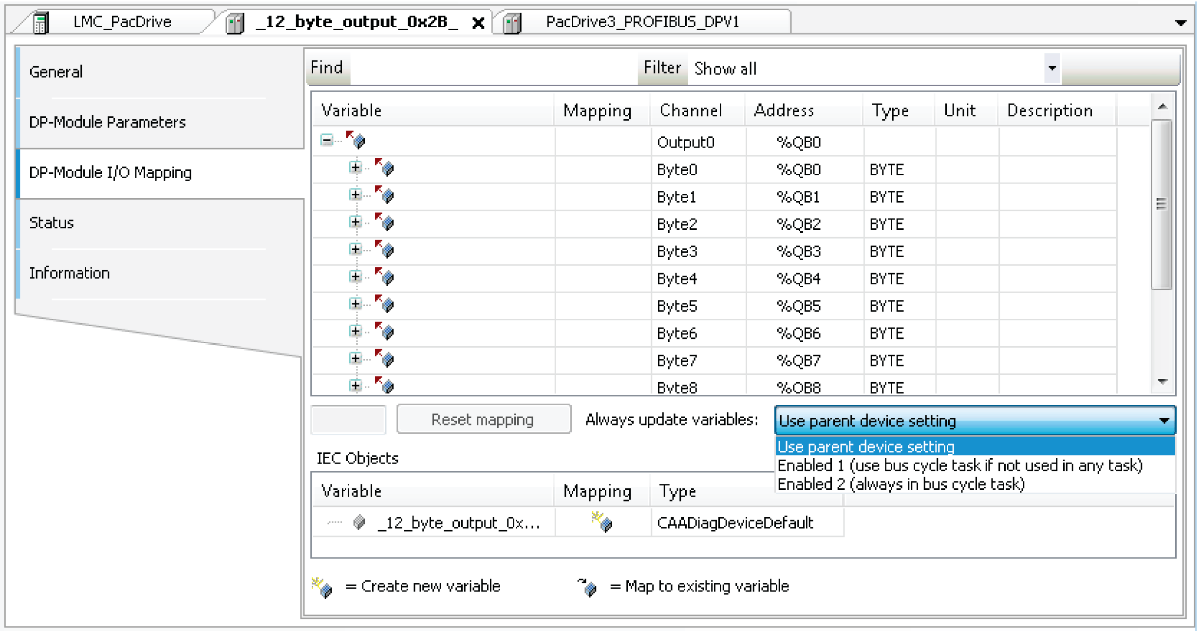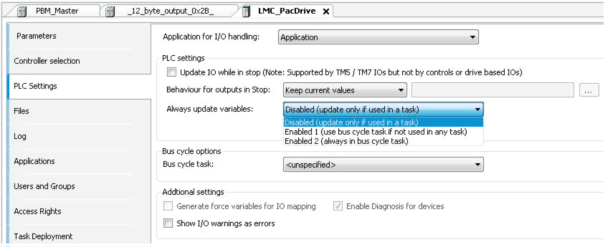 (always in bus cycle task): All variables are updated in every cycle of the bus cycle task, regardless if they are being used or if they are mapped to an input or to an output channel. You can set this option separately for each device in the I/O Mapping dialog box.