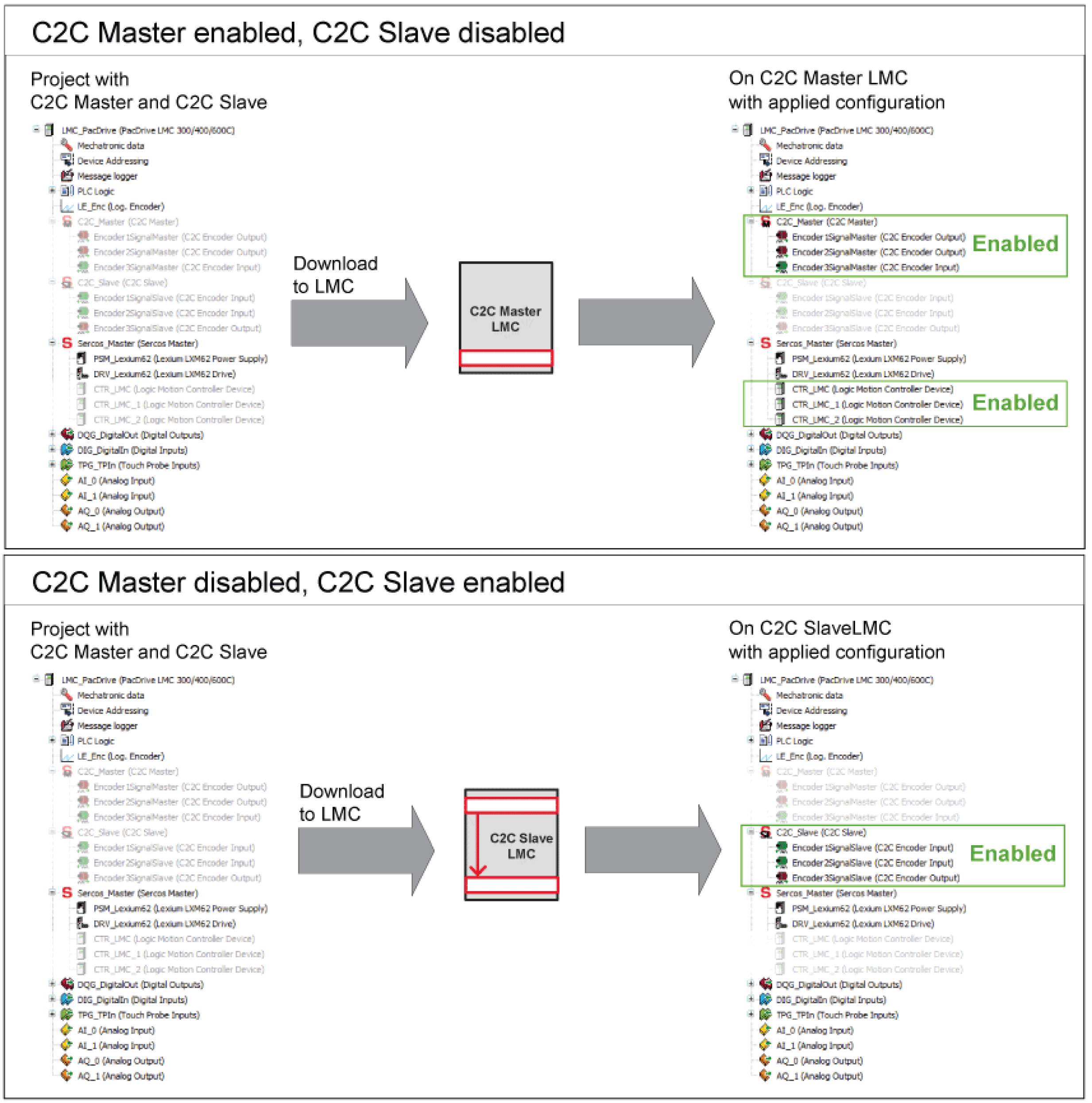 The device objects (C2C Slaves, C2C Encoder Input, etc.) must be consistently enabled/disabled in the EcoStruxure Machine Expert project of the C2C Master and in the project of the C2C Slave before the Sercos phase up has been completed in the C2C network layer.