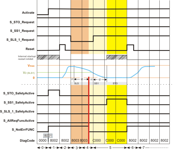 In the following example sequence, the SLS1 safety-related function requested by a safety-related command device (a key switch for a door open request, for example) cannot be activated successfully. Therefore, first SS1 and then STO are activated which are defined as the fallback functions of the SLS1 safety-related function.