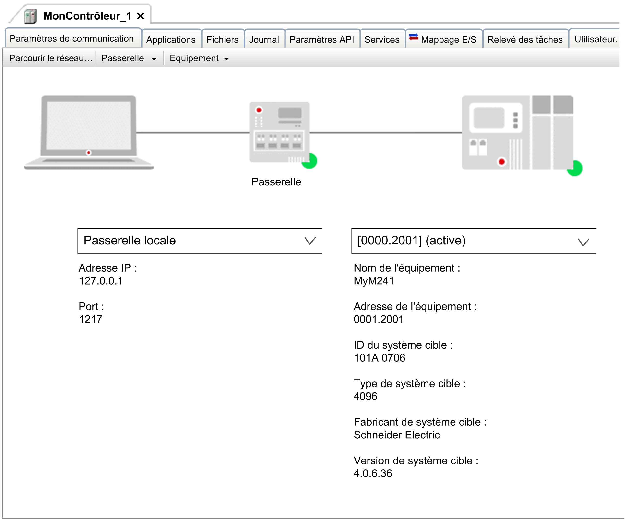 L'onglet en mode Simple s'affiche lorsque le a été sélectionné pour le paramètre dans la boîte de dialogue . Il propose un affichage graphique qui permet de paramétrer la communication entre l'équipement et le système de programmation.