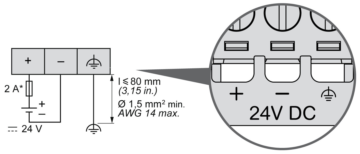 Le M241 Logic Controller et les E/S associées (TM2, TM3 et E/S intégrées) requièrent une tension nominale d'alimentation de 24 VCC. Les alimentations 24 VCC doivent être de type SELV (Safety Extra Low Voltage) ou PELV (Protective Extra Low Voltage) conformément à la norme CEI 61140. Ces alimentations sont isolées entre les circuits électriques d'entrée et de sortie de l'alimentation.