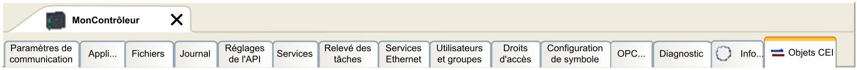 Vous permet d'accéder à l'équipement à partir de l'application IEC via les objets répertoriés. Affiche une vue de surveillance en mode connecté. Pour plus d'informations, reportez-vous à la rubrique Objet IEC dans l'aide en ligne de CODESYS. |