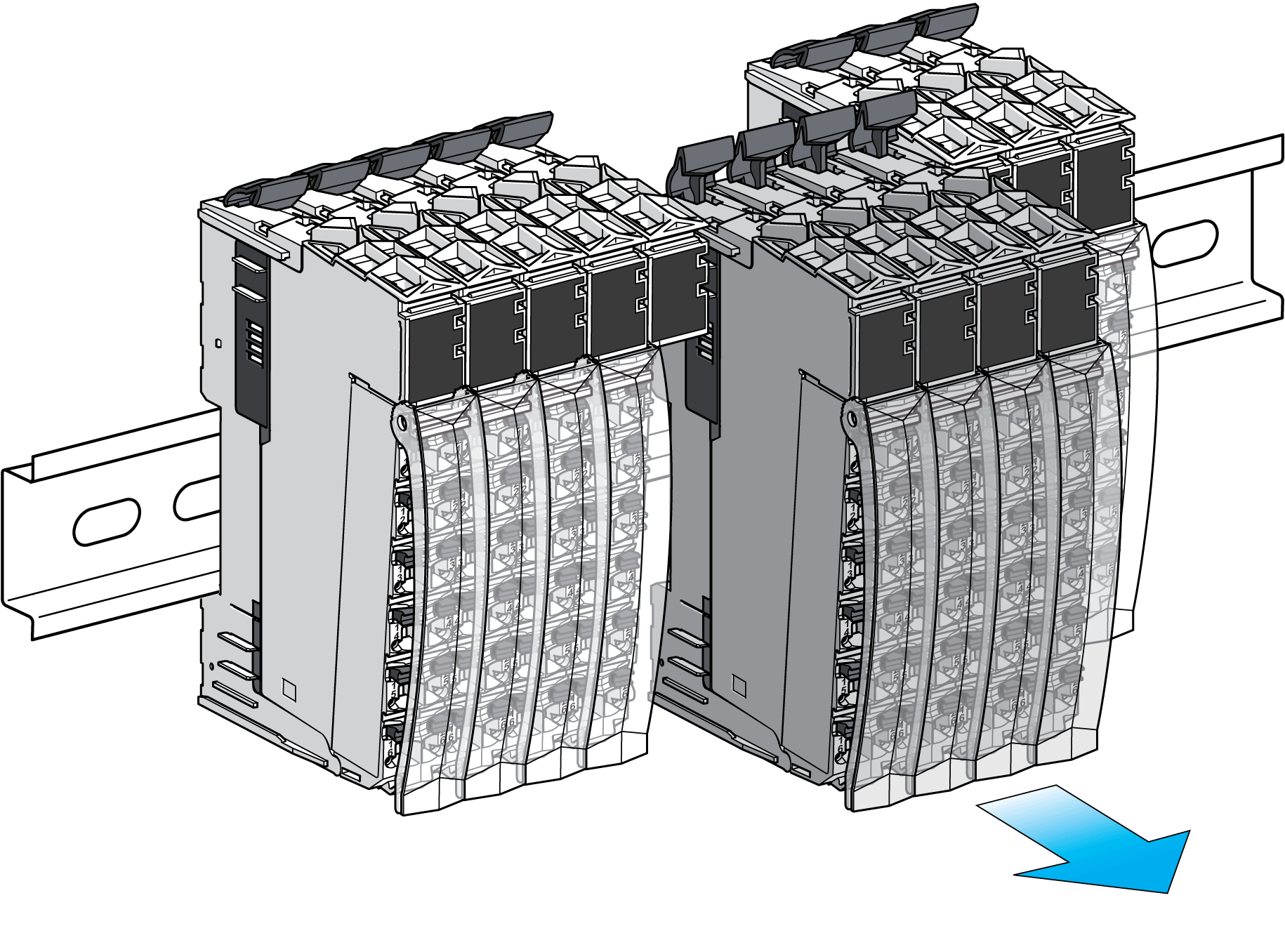 For mechanical reasons, remove the terminal block of the electronic module at the left of the partial configuration to be removed. To do this: 1 push down on the locking lever on the terminal block 2 rotate the terminal block out and down |
