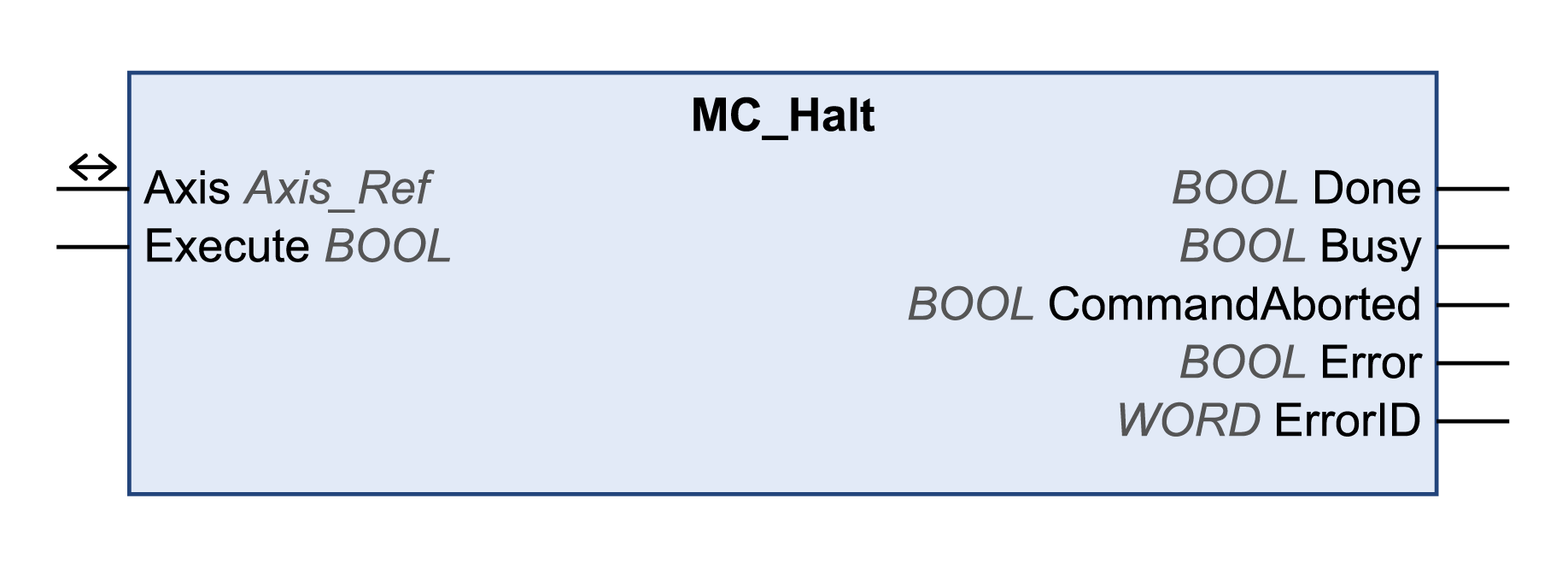 L'esecuzione del blocco funzione può essere interrotta da un altro blocco funzione. Se viene attivato un Halt, avviene una transizione dello stato PLCopen a Discrete Motion finché il motore raggiunge uno stato di fermo. Quando il motore ha raggiunto lo stato di fermo, viene impostata l'uscita Done e lo stato passa a StandStill.