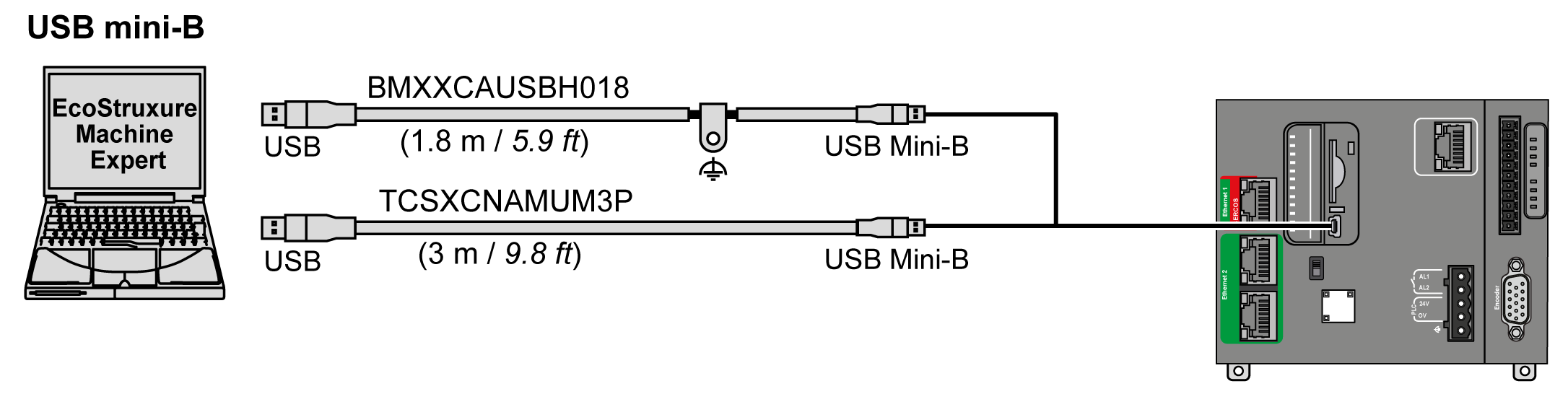 La porta di programmazione USB Mini-B è la porta di programmazione che si può utilizzare per collegare un PC con una porta host USB mediante il software EcoStruxure Machine Expert. Mediante un normale cavo USB, questo collegamento è idoneo per veloci aggiornamenti del programma o per connessioni di breve durata al fine di effettuare la manutenzione e analizzare i valori dei dati. Non è idoneo per collegamenti di lunga durata, come la messa in servizio o il monitoraggio senza l'uso di cavi adattati in modo specifico per ridurre gli effetti delle interferenze elettromagnetiche.