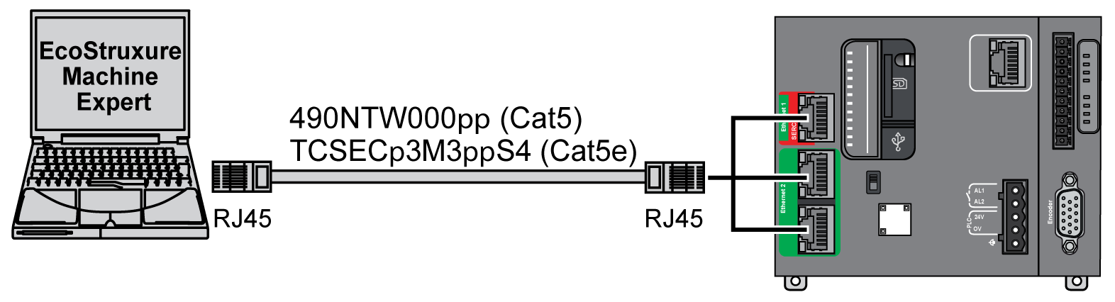 Per trasferire, eseguire e monitorare le applicazioni, è possibile utilizzare un cavo USB o una connessione Ethernet per collegare il controller a un computer con EcoStruxure Machine Expert installato.