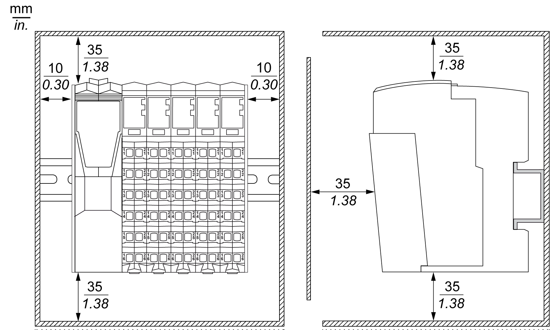 The TM5 System components have an IP20 rating and must be enclosed. For optimal cooling and air circulation, an adequate clearance must be respected between your TM5 System (installed in the enclosure) and surrounding fixed objects (such as wire ducts and inside surfaces of the enclosure).
