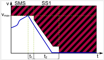 For the SS1 function, the position is monitored after zero speed has been achieved and while t2 has not yet elapsed, i.e., as long as STO is not yet active.