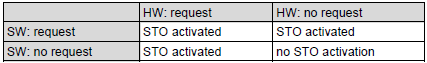 In the tables above, SW means "software STO request via the S_STO_Request input of the function block" and HW means "hard-wired STO request". |