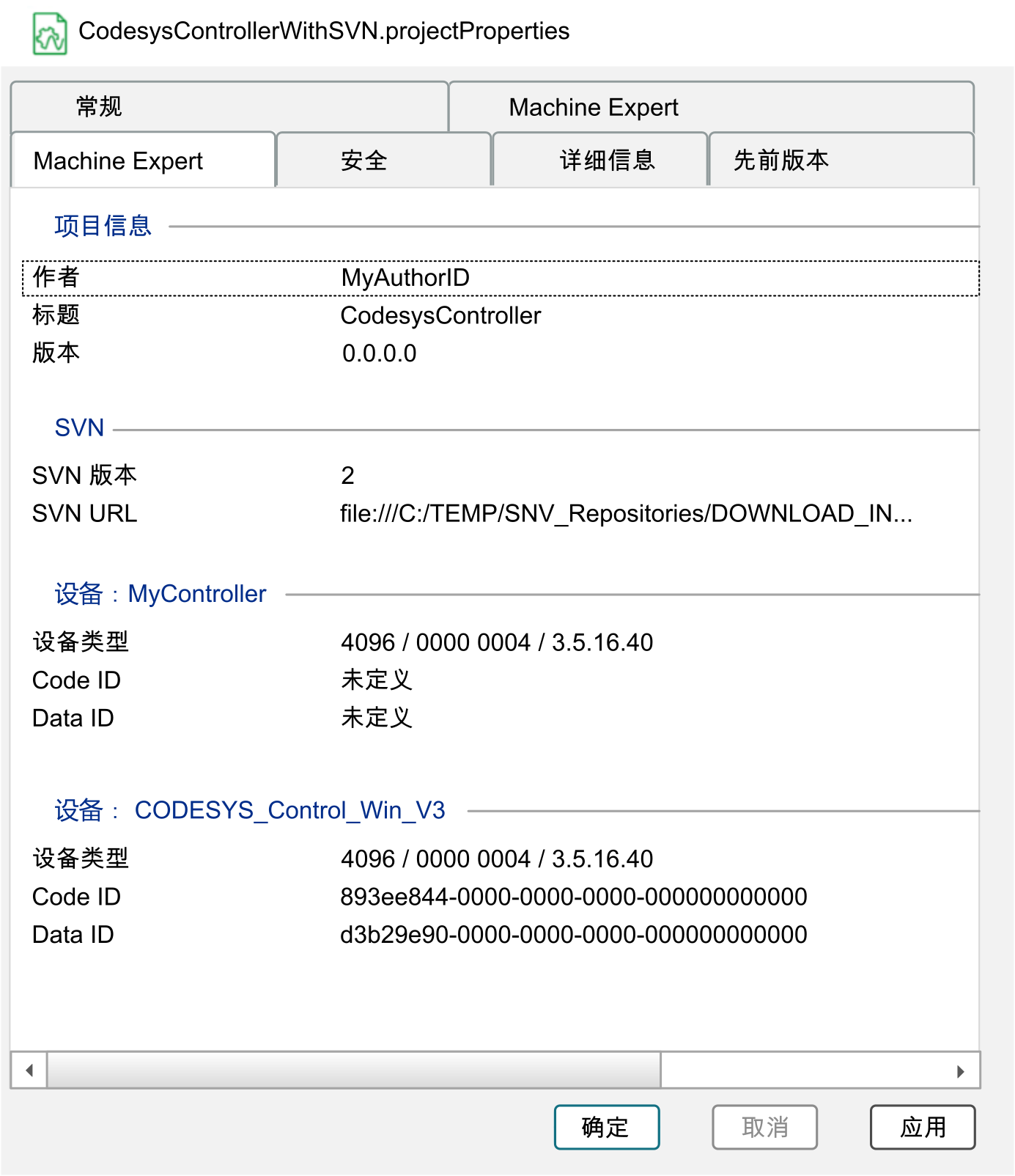 和 信息让您能够标识应用程序以及正在控制器上运行的应用程序的版本,而无需在 EcoStruxure Machine Expert 中打开项目(另请参阅 创建和访问 Code ID / Data ID)。如要验证应用程序及其版本,可以将文件属性中提供的信息与以下位置提供的 和 信息进行比较: