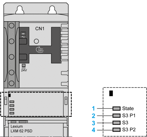 Lexium 62 Power Supply 的显示器包含四个 LED 指示灯,用于显示状态信息。
