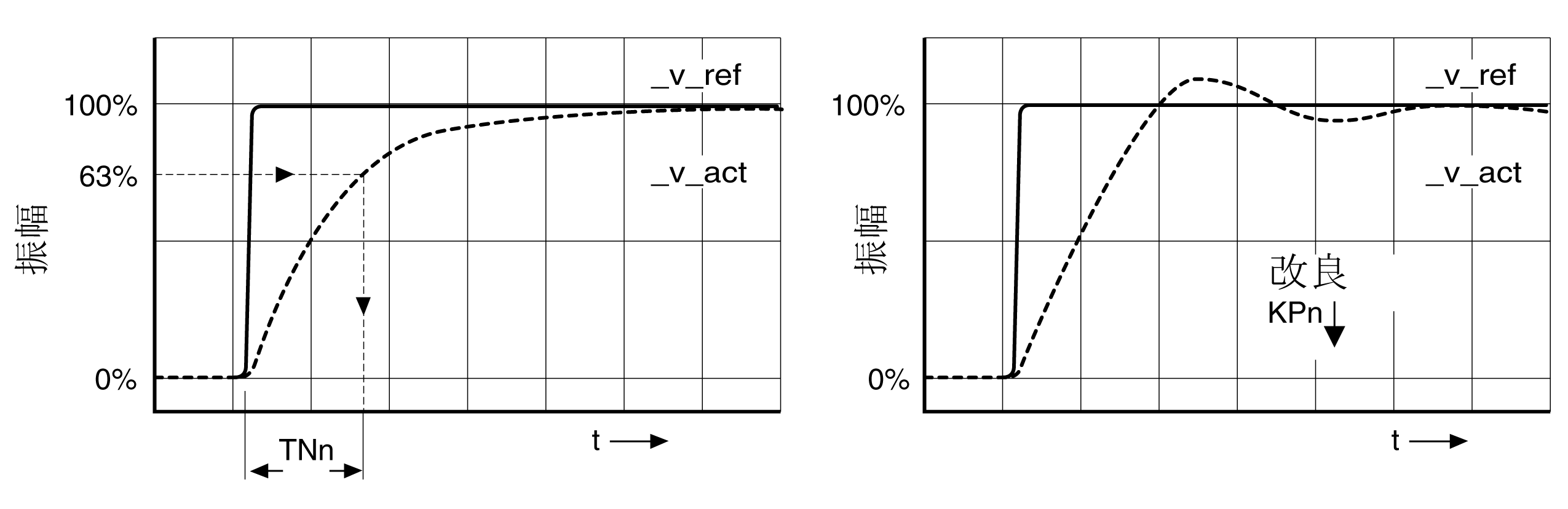 以较小的幅度增大或减小 P 系数,直到能尽可能快地设置 _v_act。下图左边为理想的起振特性。右图所示的超调,可以通过减小 CTRL1_KPn (CTRL2_KPn) 来降低。