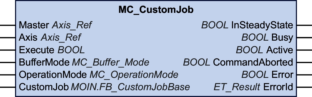 必须衍生自 FB_CustomJobBase 的用户创建功能块类型的实例。此功能块实例可以使用额外的参数(如,目标位置、速度、加速度、变化率等)根据自定义作业所使用的算法的要求来参数化。 覆盖以下方法: