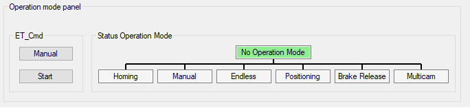 Depending on the selected tab, the upper button displays: , , , , , or . Example: If the module is not in the displayed operation mode (for example, ) click the button to send the command AXM.ET_Cmd.Manual, and then click the button to send the command AXM.ET_Cmd.Start. If the operation mode is accepted, the background color of the operation mode status switches to green. |
