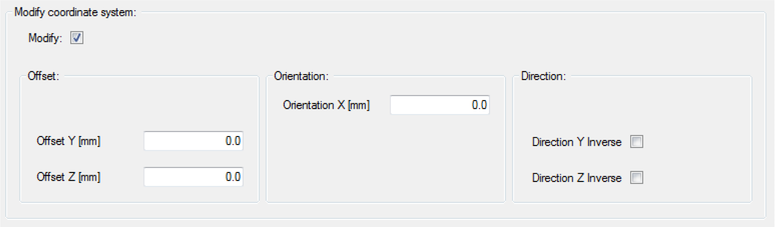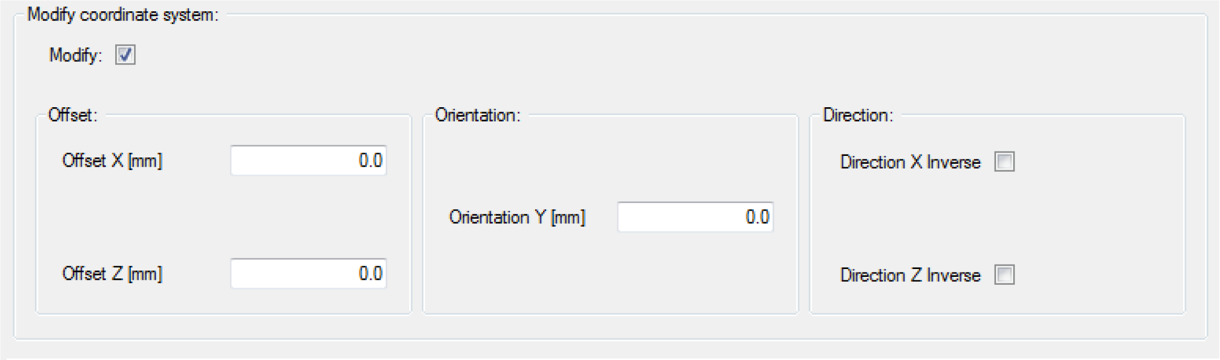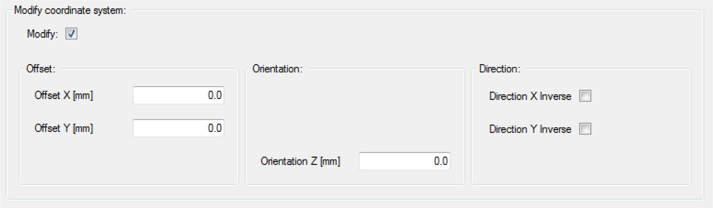 The robot coordinate system can be modified. If the check box is not set, the coordinate system is set to default values defined by the selected robot. Detailed information can be found under: ModifyCoordinateSystem in RoboticModule Library Guide. The displayed parameters depend on the configured . Working plane XY:
