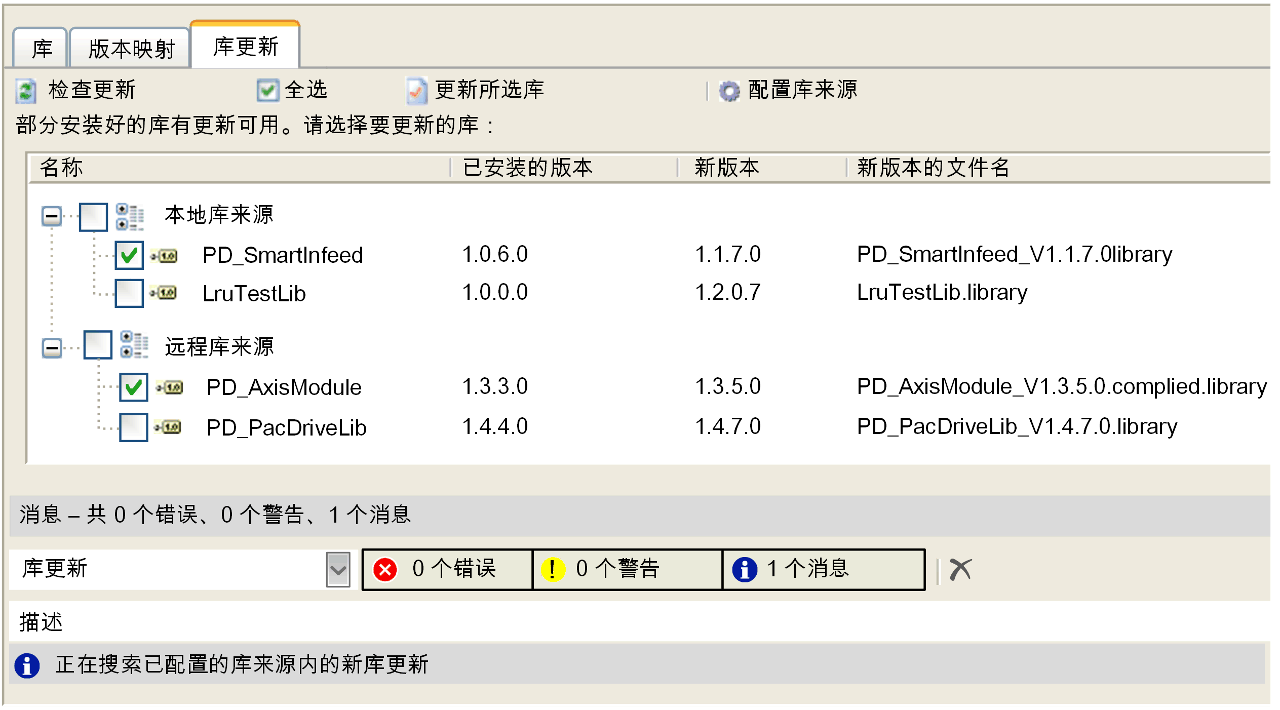 如果在文件夹中检测到的库拥有比引用库更新的版本,则此库被显示为库更新。
