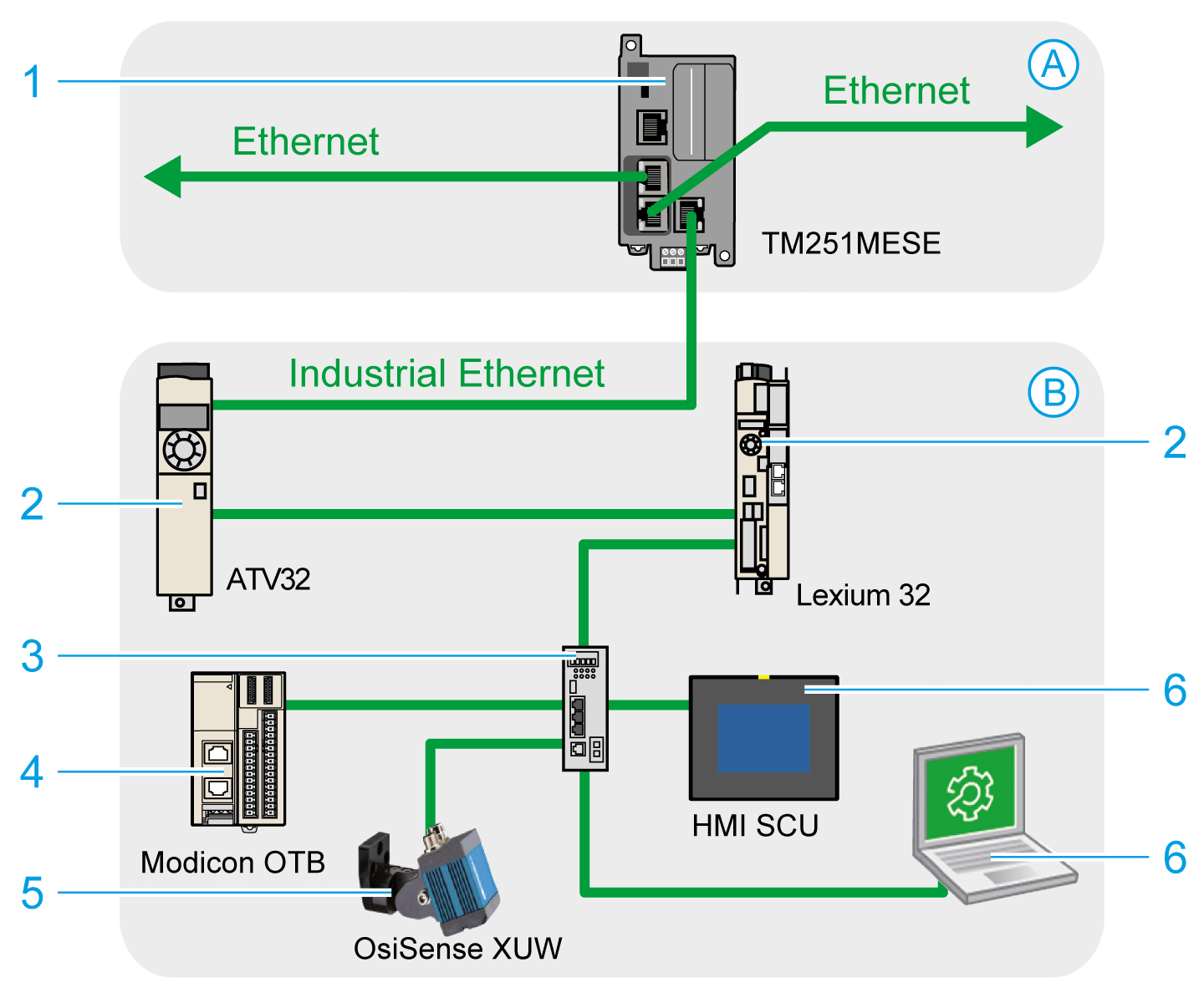 TM251MESE 有两个不同的以太网网络。每个都有自己唯一的 IP 和 MAC 地址。