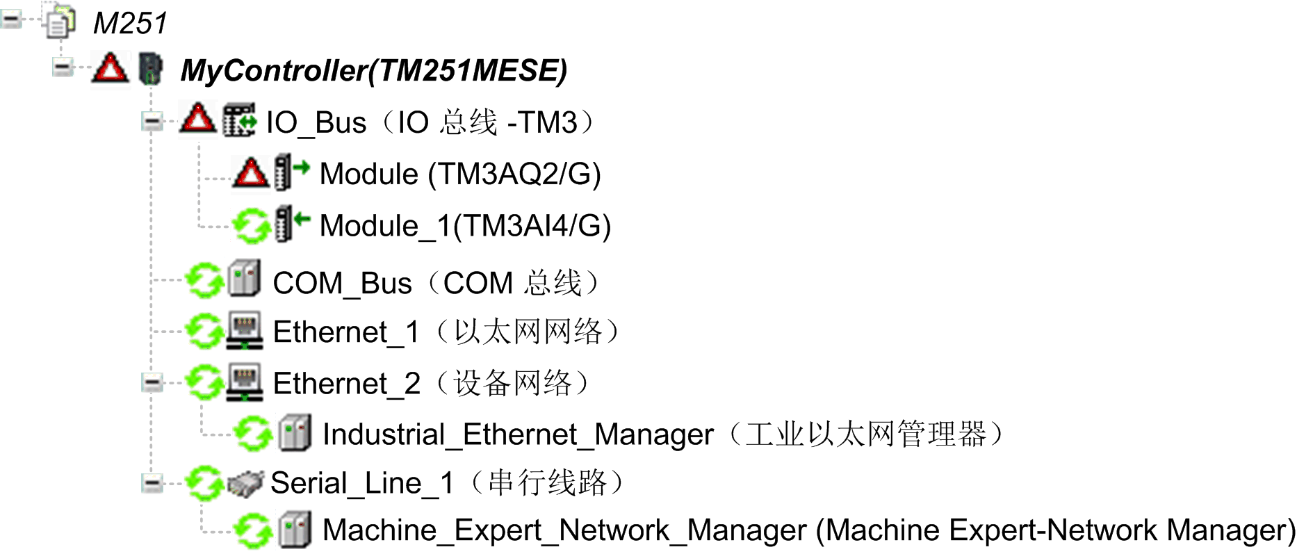 当 EcoStruxure Machine Expert 处于在线模式时,窗口中存在错误的 TM3 扩展模块和 节点旁边出现红色三角形。