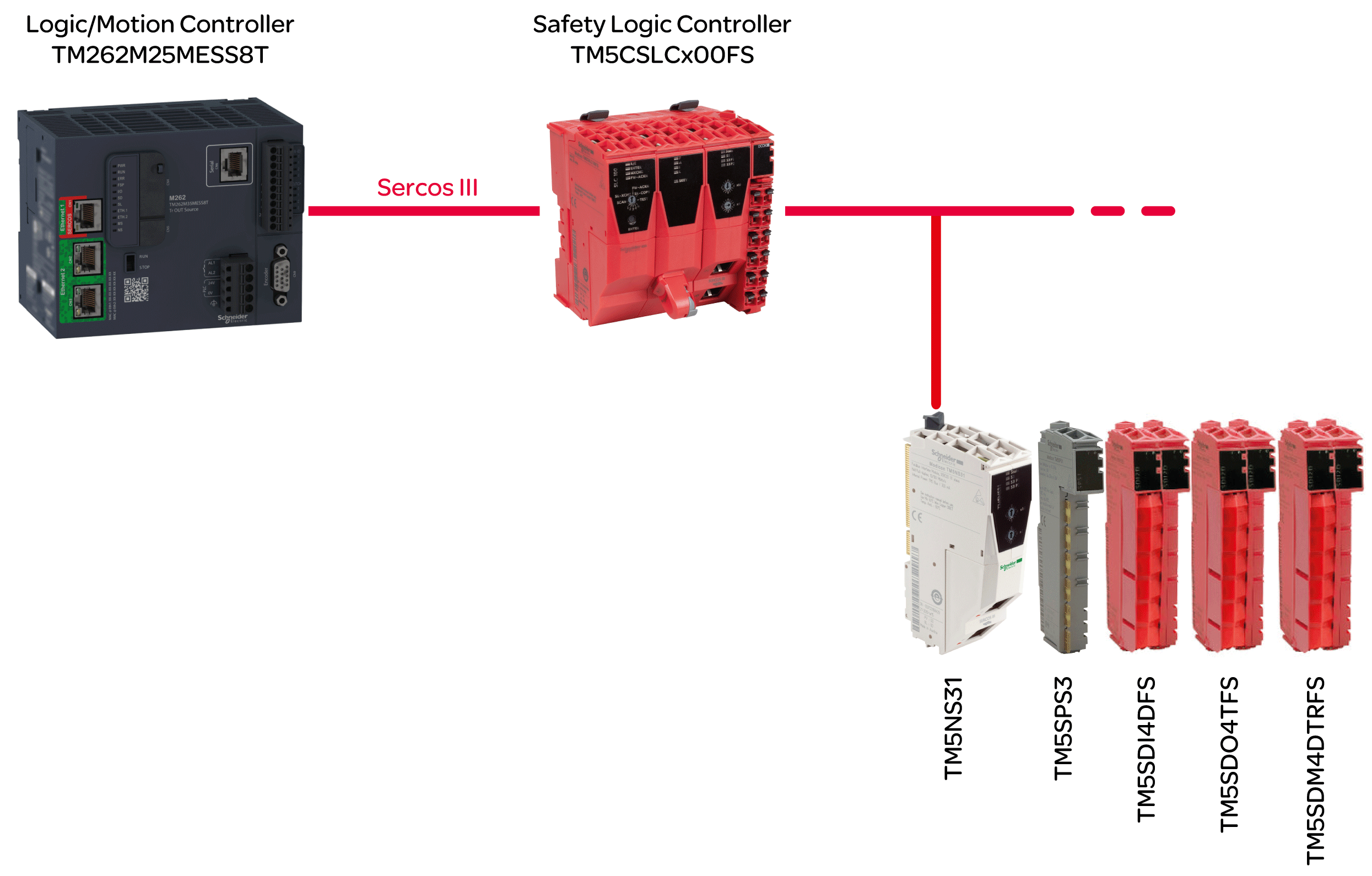 架构的安全相关部分由安全节点 (SN) 组成。SN 是 Sercos 网络中符合 openSafety 协议的节点。Schneider Electric 提供的安全相关模块为红色。它们可以通过其商业型号中附加的 FS 来辨别。