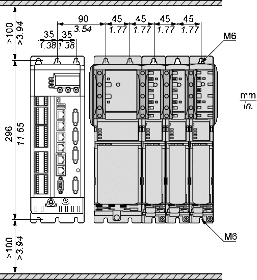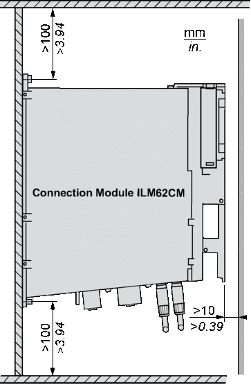 Erforderliche Abstände im Schaltschrank für den Lexium 62 Connection Module: