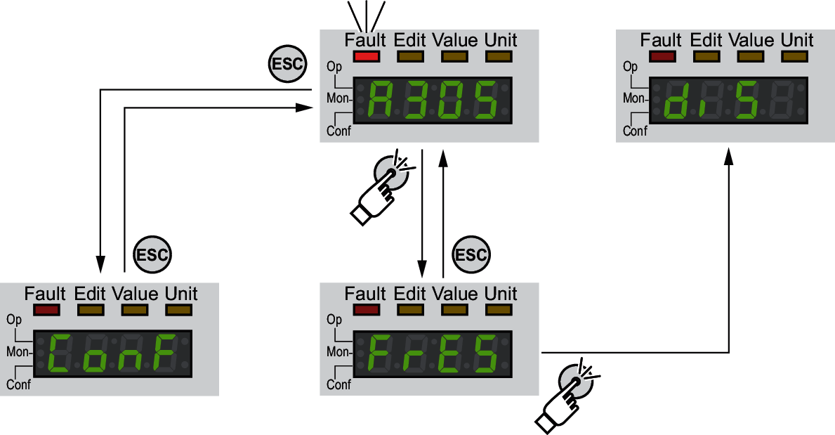 Bei einem Fehler mit der Fehlerklasse 2 oder 3 bewirkt ein Zurücksetzen der Fehlermeldung einen Wechsel aus dem Betriebszustand 9 Fault zurück in den Betriebszustand 3 Switch On Disabled.