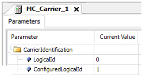 Vor dem ersten Sercos-Hochlauf müssen Sie die Identifikationsnummern (IDs) Ihrer Carrier mit dem Parameter ConfiguredLogicalId in der CarrierIdentification-Benutzerfunktion des -Objekts definieren.