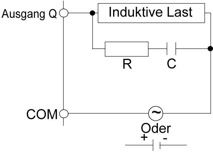 Wenn Ihre Steuerung oder Ihr Modul Relaisausgänge umfasst, bieten diese Ausgänge Unterstützung für bis zu 240 VAC. Eine Beschädigung dieser Art Ausgänge durch induktive Lasten kann zu Schweißkontakten und Steuerungsverlust führen. Induktive Lasten müssen mit einer Schutzeinrichtung ausgestattet sein, wie z. B. einem RC-Spitzenwertbegrenzer, einem RC-Stromkreis oder einer Schutzdiode. Kapazitive Lasten werden von diesen Relais nicht unterstützt.