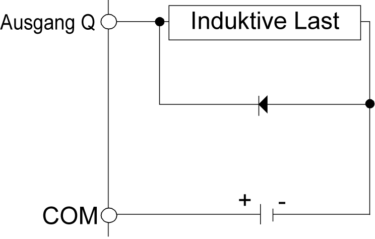 Abhängig von der Last ist für die Ausgänge an den Steuerungen und bestimmten Modulen eventuell eine Schutzschaltung erforderlich. Induktive Lasten mit Gleichspannung können Spannungsreflexionen verursachen, die zu Überschwingungen führen, die wiederum die Ausgangsgeräte beschädigen oder deren Lebensdauer verkürzen.
