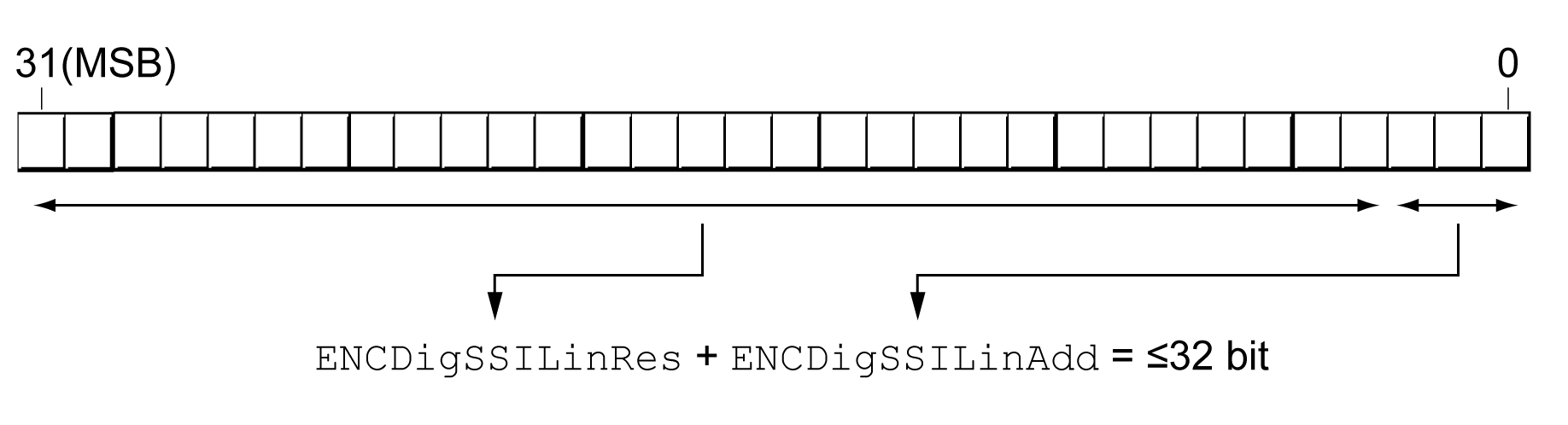 The resolution for rotary encoders can be set via the parameters ENCDigSSIResSgl and ENCDigSSIResMult. Together, the values of these parameters must not exceed 32 bits.