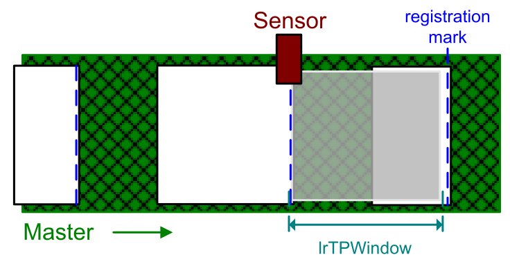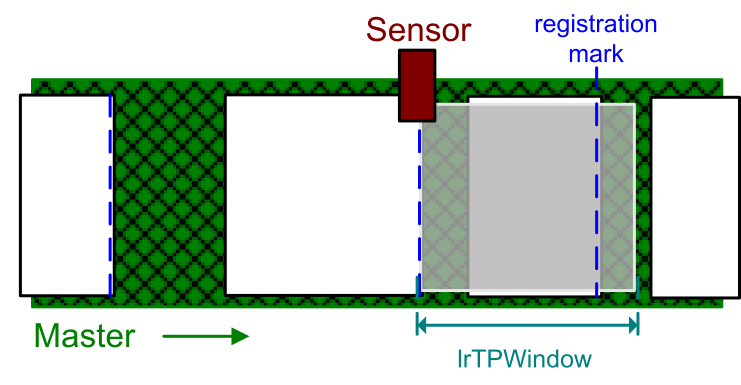 The touch probe ignorance window corresponds to the parameter lrTouchProbeWindow. It defines a range after the sensor in which detected touch probe signals are ignored as long as the registration mark of the previous touch probe signal is inside this window.