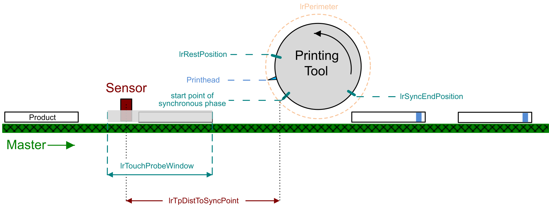 For the calculation of the curves and the validation of the touch probe signals, the parameter lrTpDistToSyncPoint is required. This parameter defines the distance between the center point of the sensor and the start point of the synchronous phase.