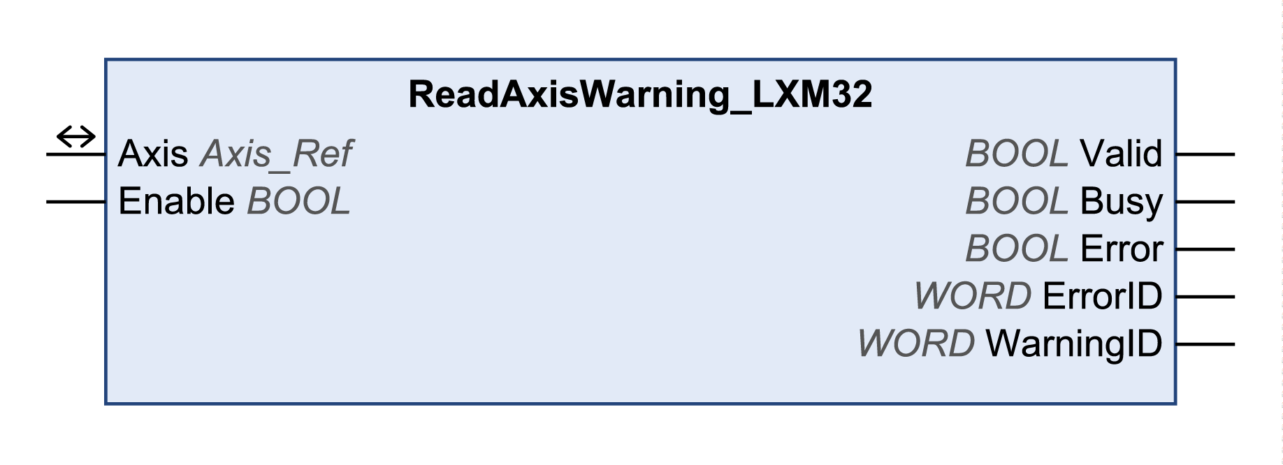 Returns the value of a diagnostic code. Refer to Library Diagnostic Codes. If the value is 0 and if the output Error of this function block is set to TRUE, then the diagnostic code can be read with the output AxisErrorID of the function block MC_ReadAxisError. |