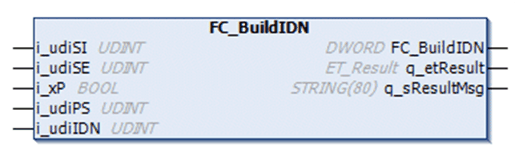 The function FC_BuildIDN builds the structured IDN with the input values from the symbolic addressing (<S/P>-<PS>-<DBN>.<SI>.<SE>). The function verifies the input values. If an input is determined to be invalid, a result code is given. In this case, the return value FC_BuildIDN is set to FALSE.