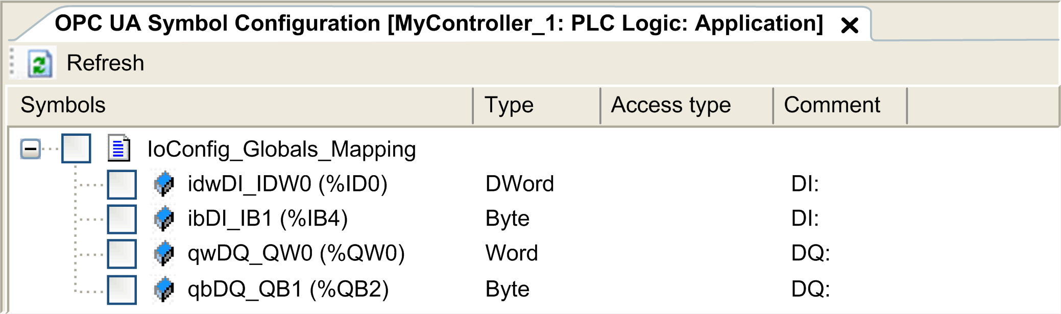 Bit memory variables (%MX) cannot be selected. In addition to IEC base data types, the OPC UA server can also expose OPC UA variables from IEC symbols that are composed of the following complex types: