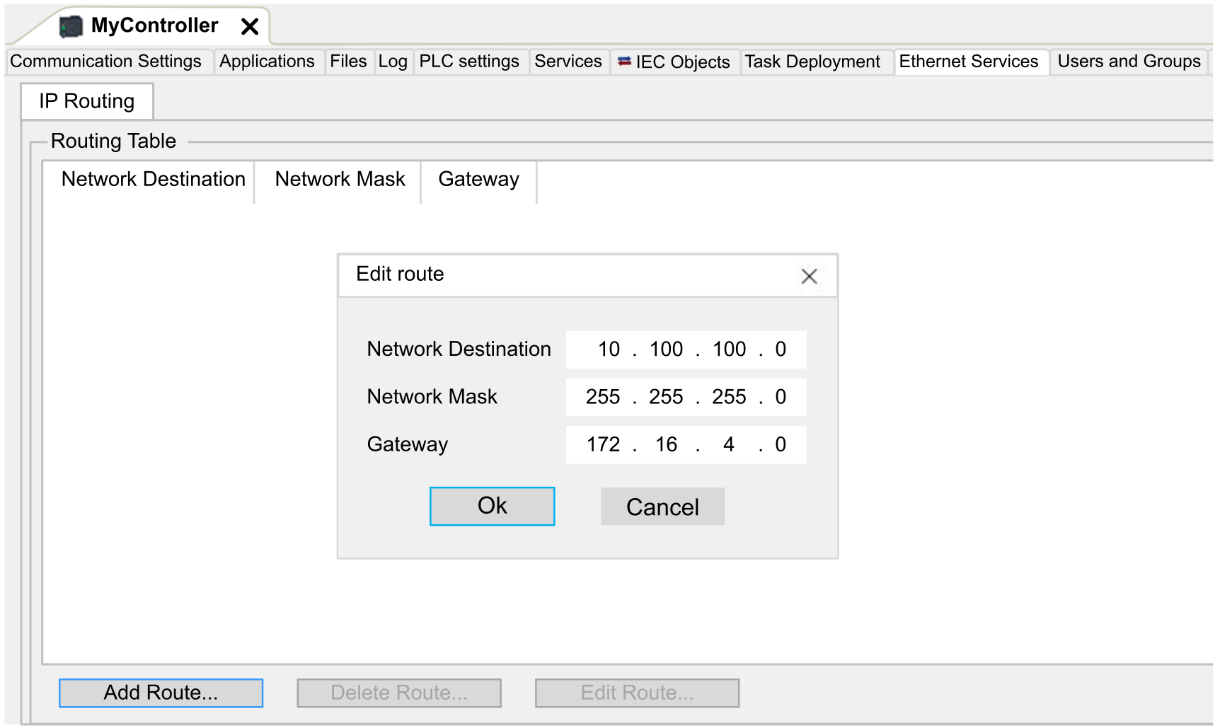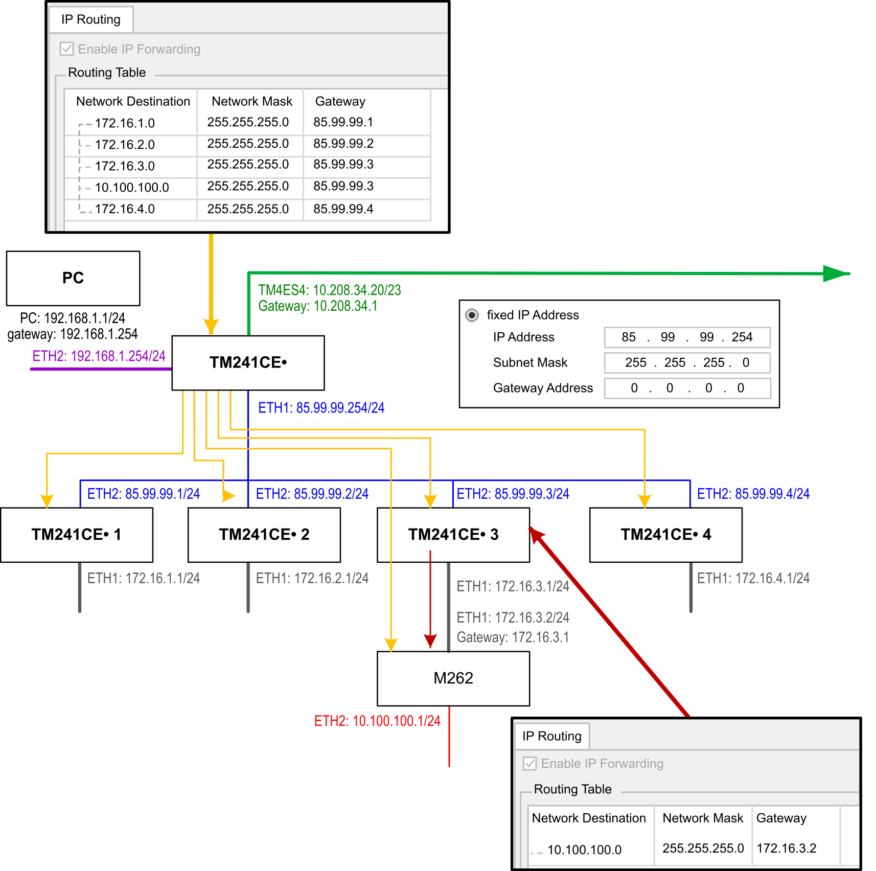 The M241 Logic Controller can have up to two Ethernet interfaces. Using a routing table is necessary to communicate with remote networks connected to different Ethernet interfaces. The gateway is the IP address used to connect to the remote network, which needs to be in local network of the controller.